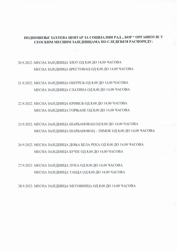 “Kako bi smo olakšali našim najstarijim i sugrađanima koji žive u seoskim mesnim zajednicama napravljen je nov raspored i stručni radnici Centra za socijalni rad će biti raspoređeni u svim seoskim mesnim zajednicama kako bi im olakšali prikupljanje dokumentacije. ”, rekla je Jelena Ristić, v.d. direktora Centra za socijalni rad i dodala da građani nemaju potrebe da iz katastra za nepokretnosti pribavljaju vlasnički list nepokretnosti, jer je sve urađeno u korist građana kako ne bi imali nikakve troškove.