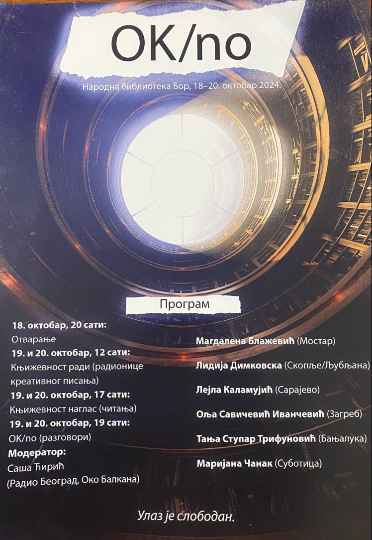 Svečano otvaranje festivala zakazano je za 18. oktobar u 20 sati u Narodnoj biblioteci Bor. Festival „OK/no“ predstavlja još jedan važan kulturni događaj u okviru obeležavanja oktobarskih svečanosti, dodatno osnažujući književnu scenu i promovišući književnost kao važan deo kulturnog identiteta.